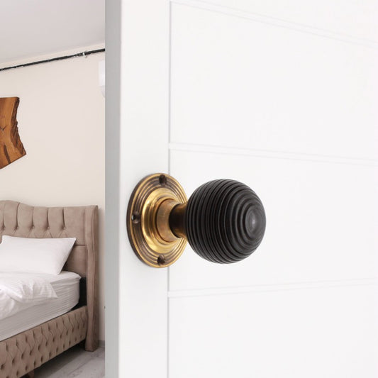 EBONISED WOOD BEEHIVE MORTICE/RIM DOOR KNOB AGED BRASS