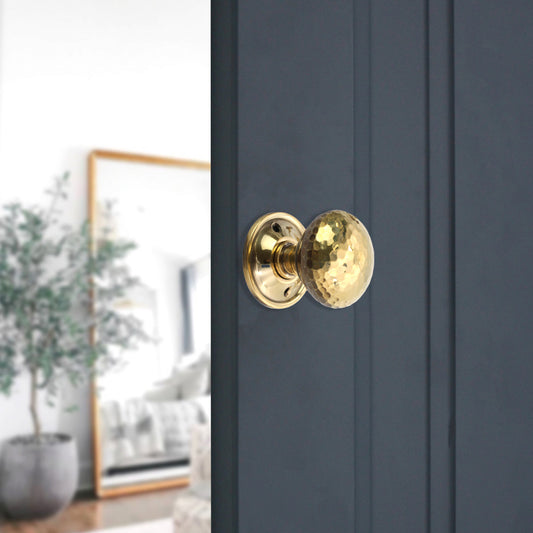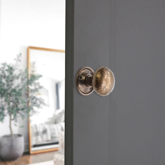 GEHÄMMERTER OVALER EINSTECK-TÜRKNAUF AUS GEALTERTEM MESSING