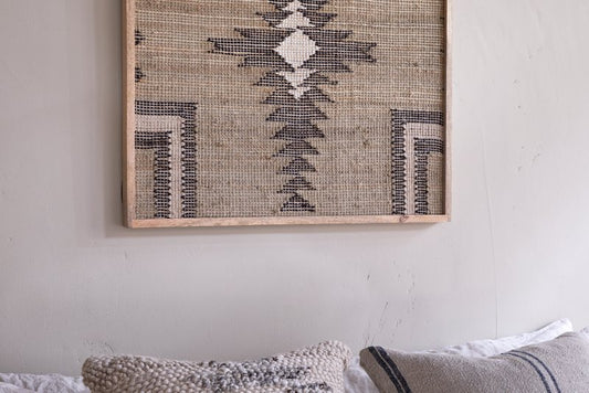 This attractive wall art piece, which indicates a traditional Indian design in elegantly modest colors, was masterfully fashioned on a traditional Indian handmade using hemp and jute, two of our favorite natural materials . Its elegantly textured finish and sustainable mango wood frame provide your living area a comfortable, natural vibe.